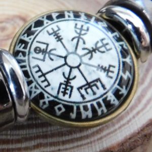 Pulsera de cuero con símbolo vikingo vegvísir negro, brújula vikinga, sobre fondo blanco y runas.