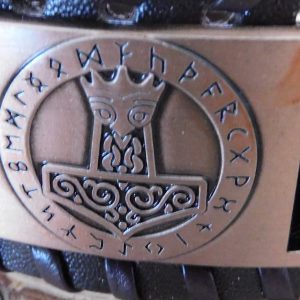 Pulsera de cuero trenzado negro con símbolo del martillo de Thor y runas.