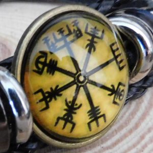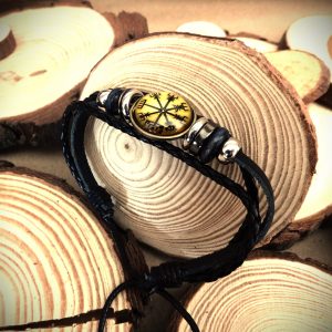 Pulsera de cuero con símbolo vegvísir, brújula vikinga, sobre fondo amarillo dorado.