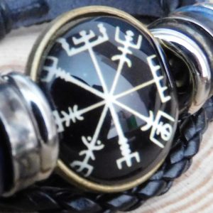 Pulsera de cuero con símbolo vegvísir, brújula vikinga ,sobre fondo negro.