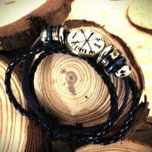 Pulsera de cuero con símbolo vegvísir, brújula vikinga, sobre fondo blanco
