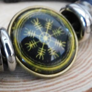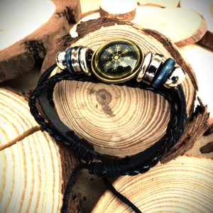 Pulsera de cuero con símbolo dorado de protección aegishjalmur, sobre fondo negro.